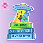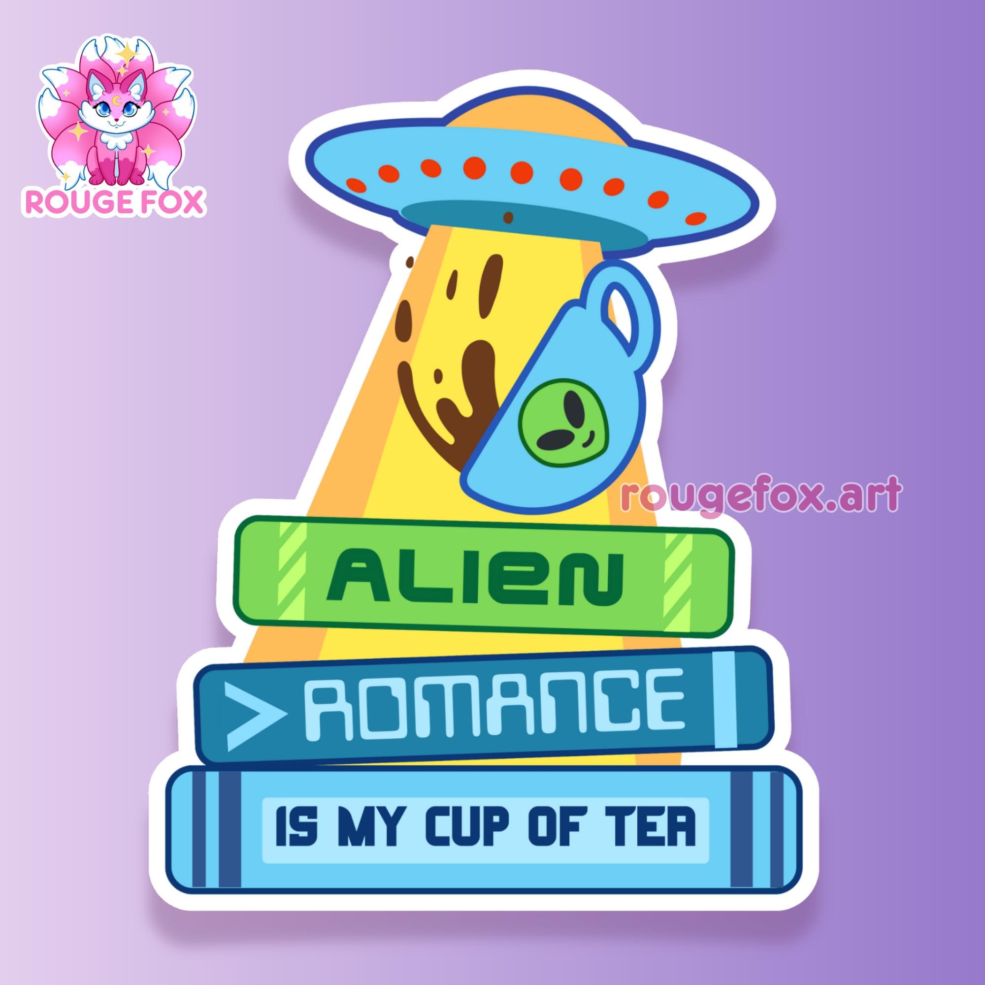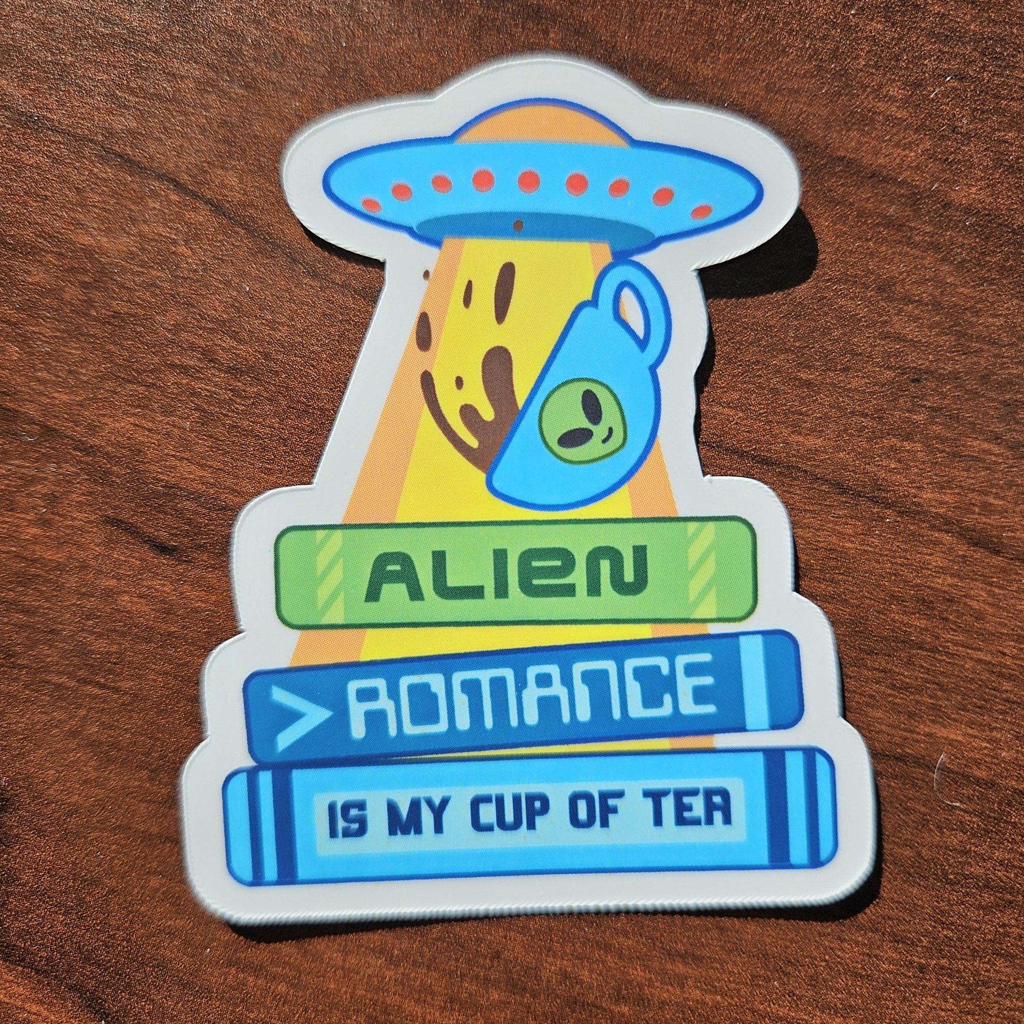 Do you like tea? Do you like Aliens in romance? This is the sticker for you! The perfect gift for anyone that wishes they could be abducted by a hot alien.