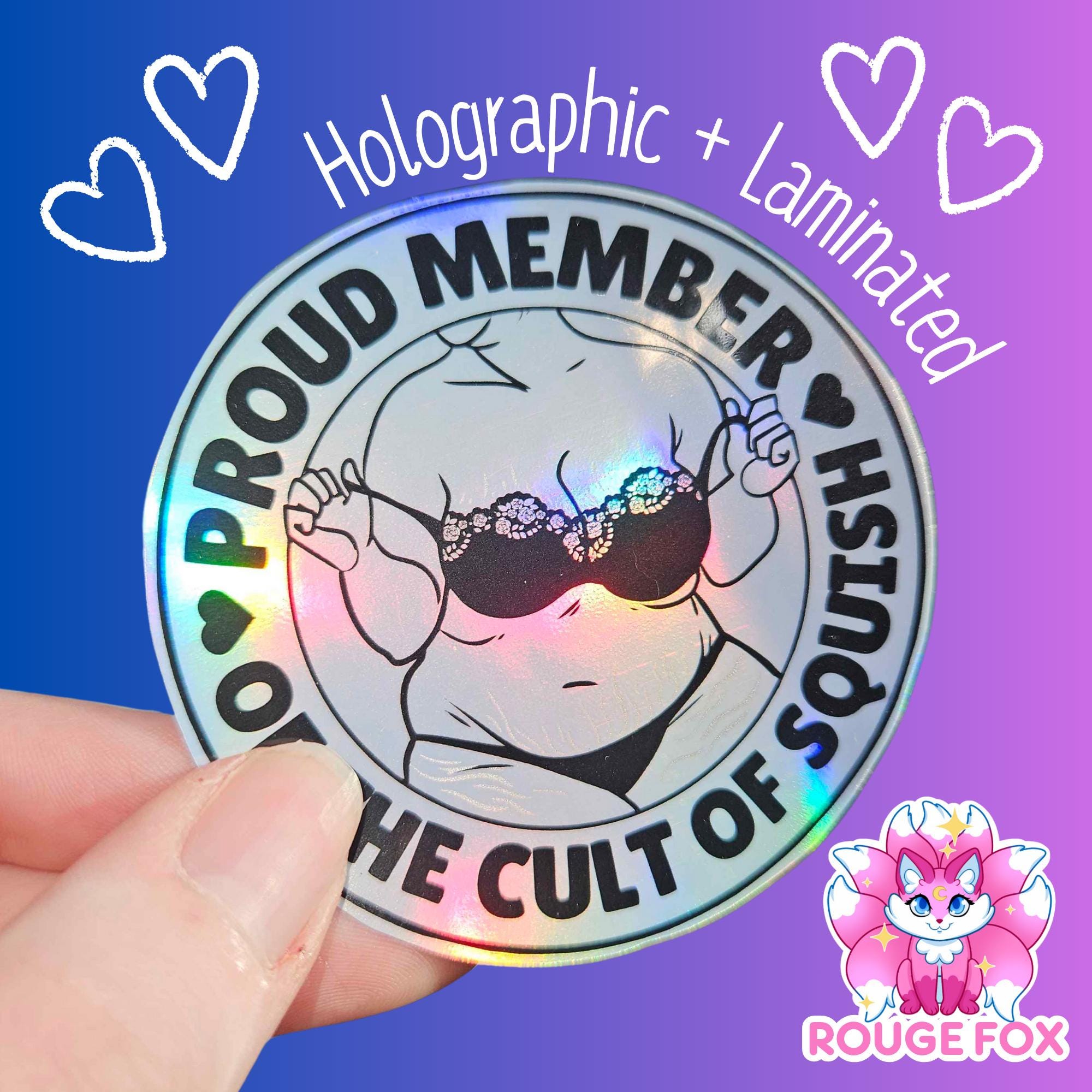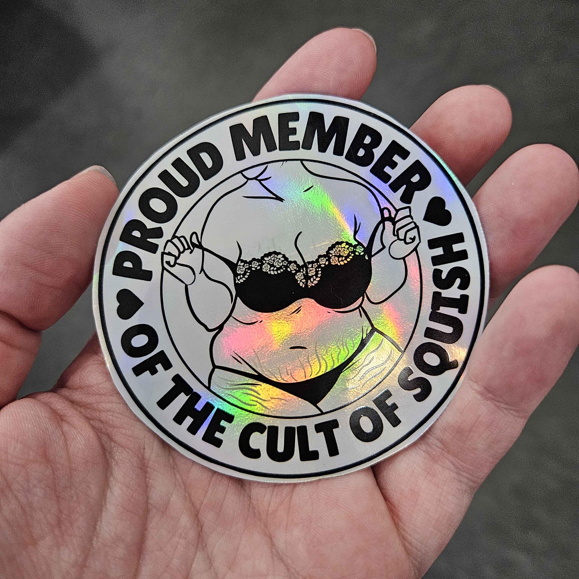 The Cult of Squish sticker is approximately 2.75"x2.75". Printed on holographic vinyl and covered in gloss laminate, so is water-resistant. Great for hand-washed water bottles, laptop decals, and scrapbooking.