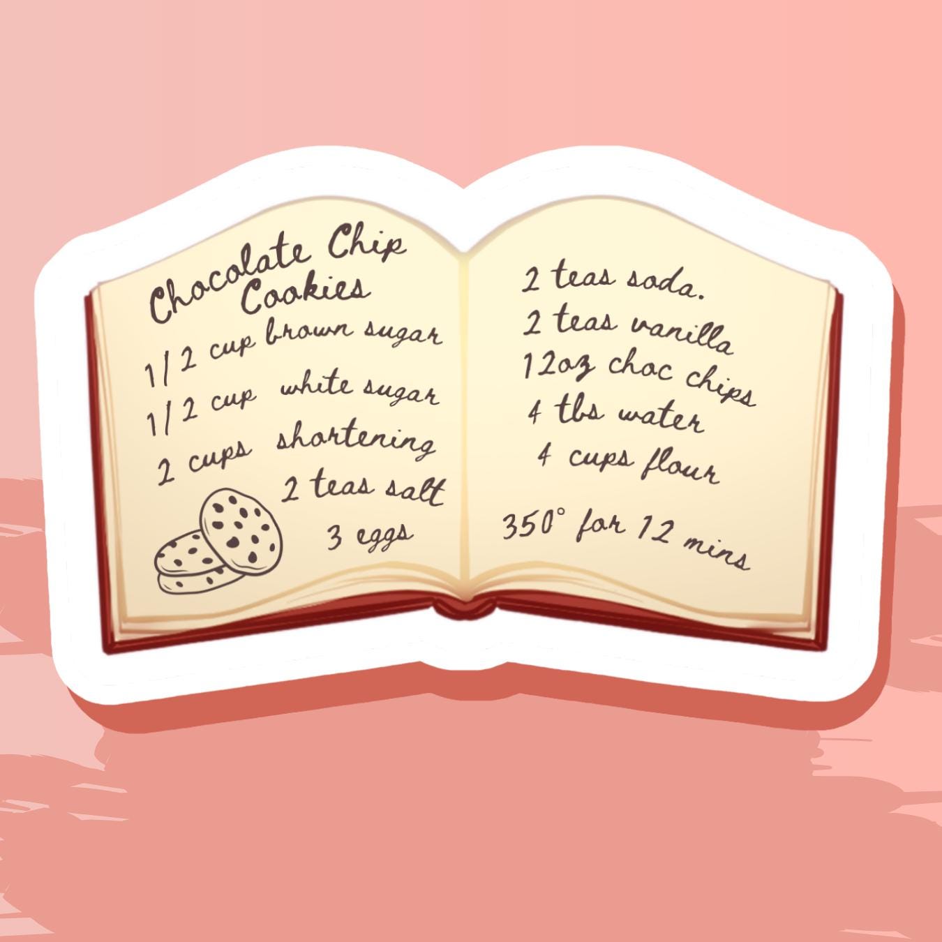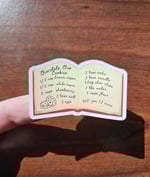 This sticker features a recipe book open to the page on how to make chocolate chip cookies. Perfect for any journal, planner, water bottles, or anywhere stickable to add that little dash of cozy.